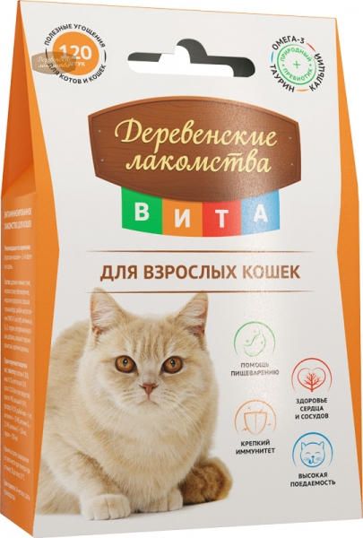 «Деревенские лакомства Вита» содержат всё необходимое для поддержания здоровья вашей кошки. Таурин поддерживает работу сердца и сосудов, омега-3 улучшает зрение и работу мозга. Топинамбур содержит природный пребиотик инулин, который содействует пищеварению и выводу токсинов, а морские водоросли укрепляют иммунитет и делают шерсть блестящей. Ну и конечно же, «Деревенские лакомства Вита» — это еще и очень вкусно!